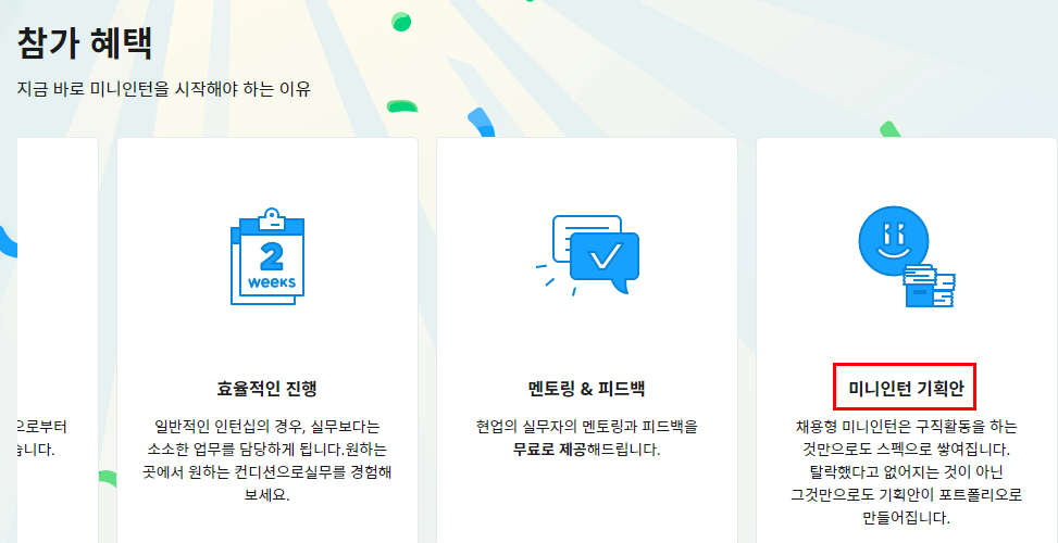 역시 메인 페이지에 목적이 잘 나와있다. 2주만에 실무 경험을 만드는 미니인턴.